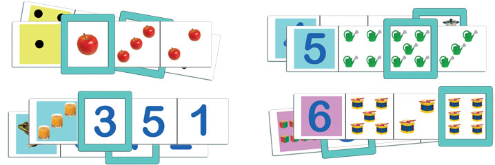Pomôcka na vyvodenie čísel od 1 do 10. Sada farebných obrázkov pomáha deťom pri utvrdzovaní predstavy čísla od 1do 10 a vytváraní vzťahu medzi počtom prvkov a číselným alebo prstovým vyjadrením.