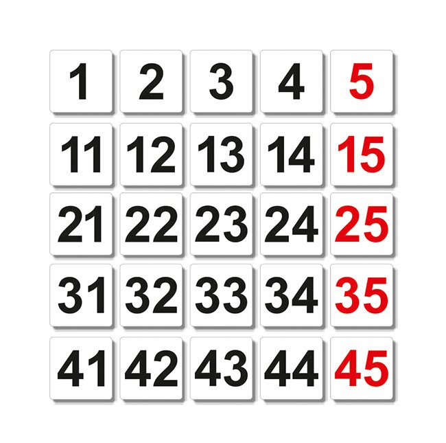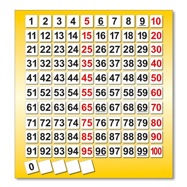 Dôležitá pomôcka pre jednoduchšiu predstavu a orientáciu v číselnom rade 0 až 100. Využitie na plastovej tabuli. Obojstranné čierno/červené kartičky s číslami, doplnené čistými kartičkami na riešenie rôznych numerických príkladov.