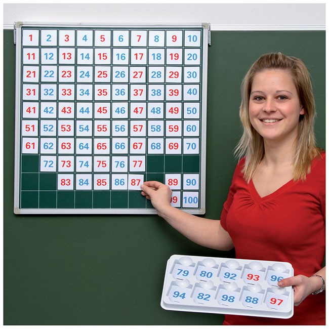 Magnetická tabuľa so stovkovou sieťou, na ktorú je možné umiestňovať magnetické kartičky s číslami. Pre ešte väčšiu univerzálnosť sú magnetické čísla obojstranne potlačené - modrou a červenou farbou. To umožňuje vyhľadávanie a zvýrazňovanie matematických postupností, vzťahov a riešenie rôznych príkladov.