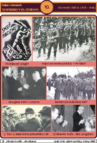 Slováci a Česi v dobe 1. svetovej vojny (légie, Štefánik ad.), vznik Česko-Slovenskej republiky (vyhlásenie republiky, predstavitelia štátu, národnostné a sociálne problémy ad.), ČSR 1918 – 1938 (politická a národnostná problematika, školstvo a kultúra, hospodárska kríza ad.), obdobie mníchovskej krízy, Česko-Slovensko 1938 – 1939, Slovensko 1939 – 1945 (verejní predstavitelia, priemysel, deportácie Židov, SNP ad.), československí vojaci na frontoch 2. svetovej vojny (Británia, ZSSR, Dukla ad.)11 far. nást. obrazov 45 x 31 cm