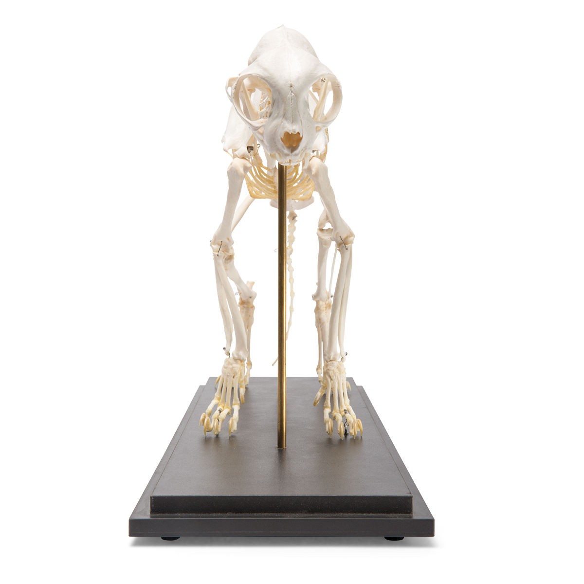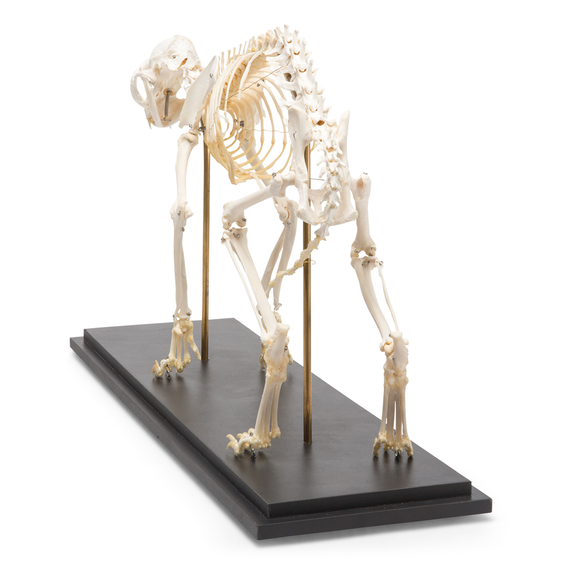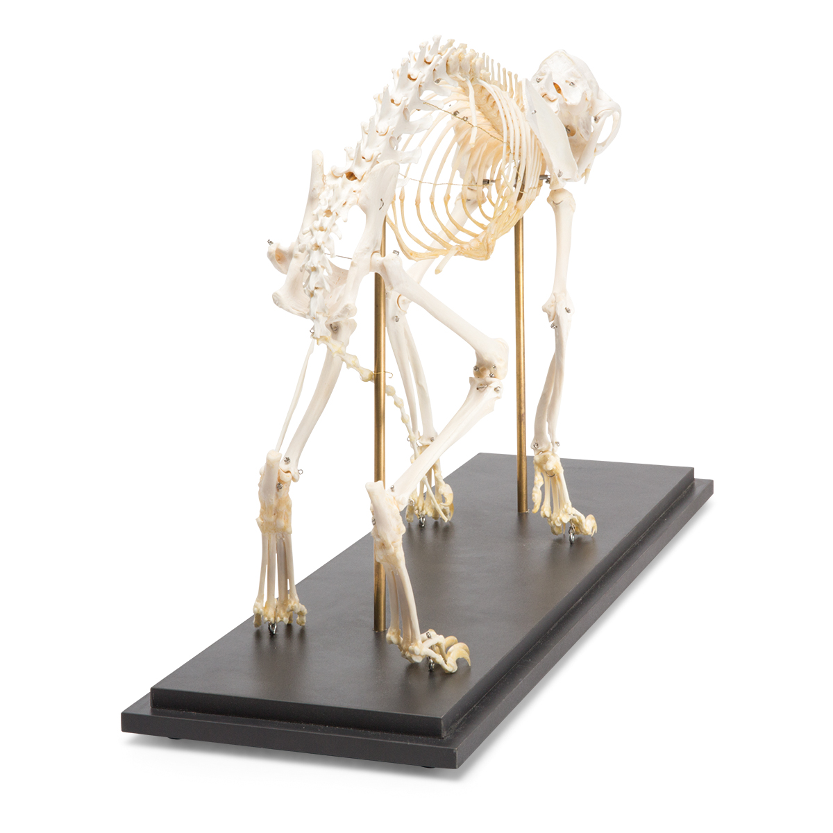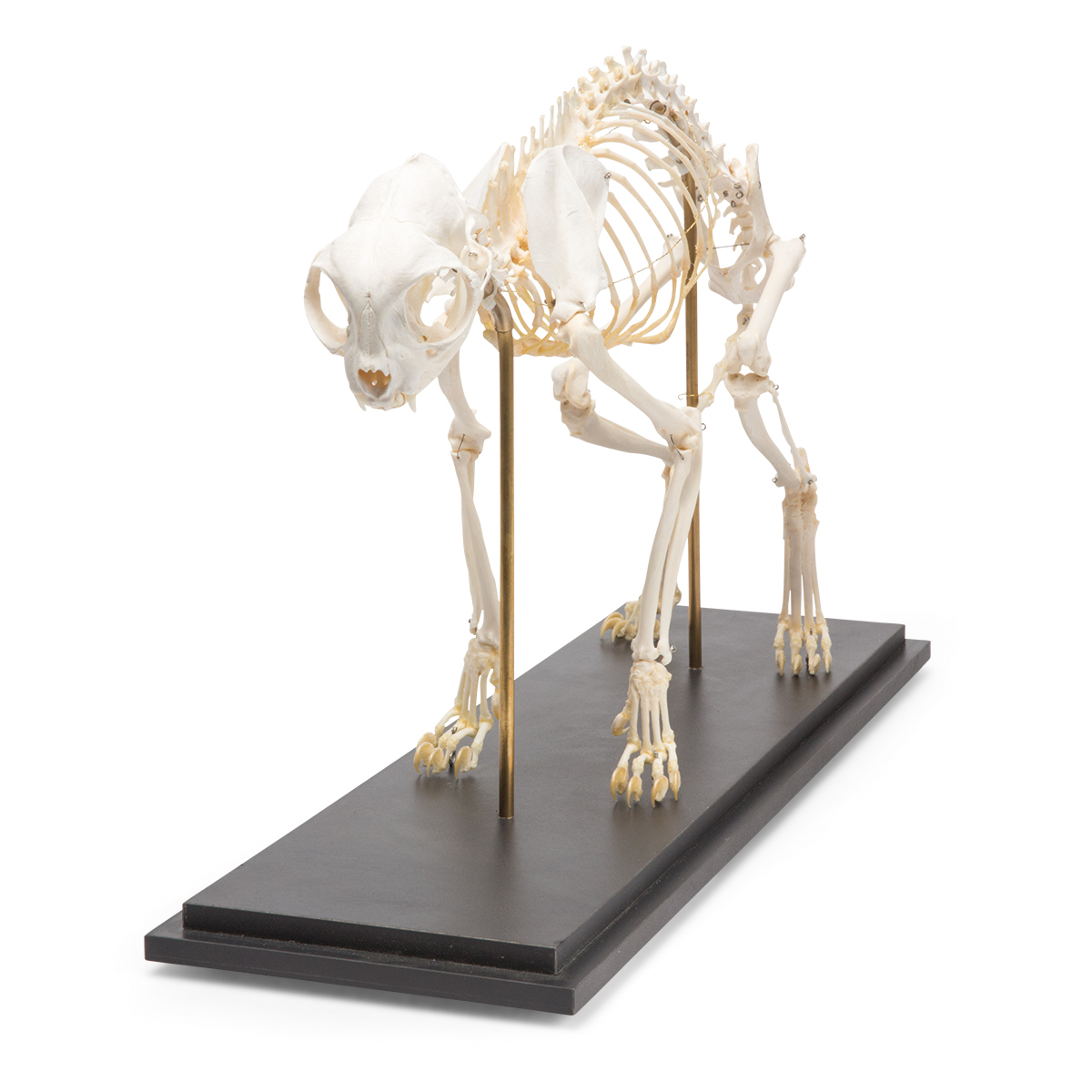 Preparovaná kostra skutočnej mačky domácej pozostávajúca z viac ako 230 kostí (v závislosti od dĺžky chvosta) namontovaná na drevenom podstavci.Dĺžka:50 až 70cm.Šírka:27 - 35cm.Výška:40 - 60cm.Hmotnosť:3,6 - 4,5kg.