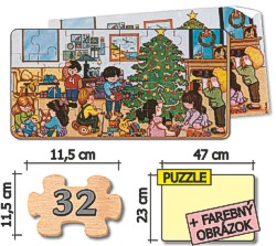 O tom, že deti radi skladajú puzzle niet pochýb. V našej ponuke týchto pestrých, poučných a tvorivých hier je možnosť výberu od najjednoduchších 8-kusových až po zložité 48 a 50-kusové puzzle. Sú doporučované deťom od 3 rokov. Rozvíjajú ich postreh, analyticko-syntetické myslenie, manuálnu obratnosť a vizuálne vnímanie. Jednotlivé témy na obrázkoch sú deťom veľmi blízke obohacujú ich detskú fantáziu a v širokej miere aj ich rečové schopnosti.Obsah dodávky: Puzzle - 32 častí, vyseknuté z 3mm preglejky. Rozmer poskladaného obrázku je 47x23 cm. Samostatný obrázok s ilustráciou, ktorá menej zdatným uľahčuje zloženie. Hra je balená v kartónovej krabici.