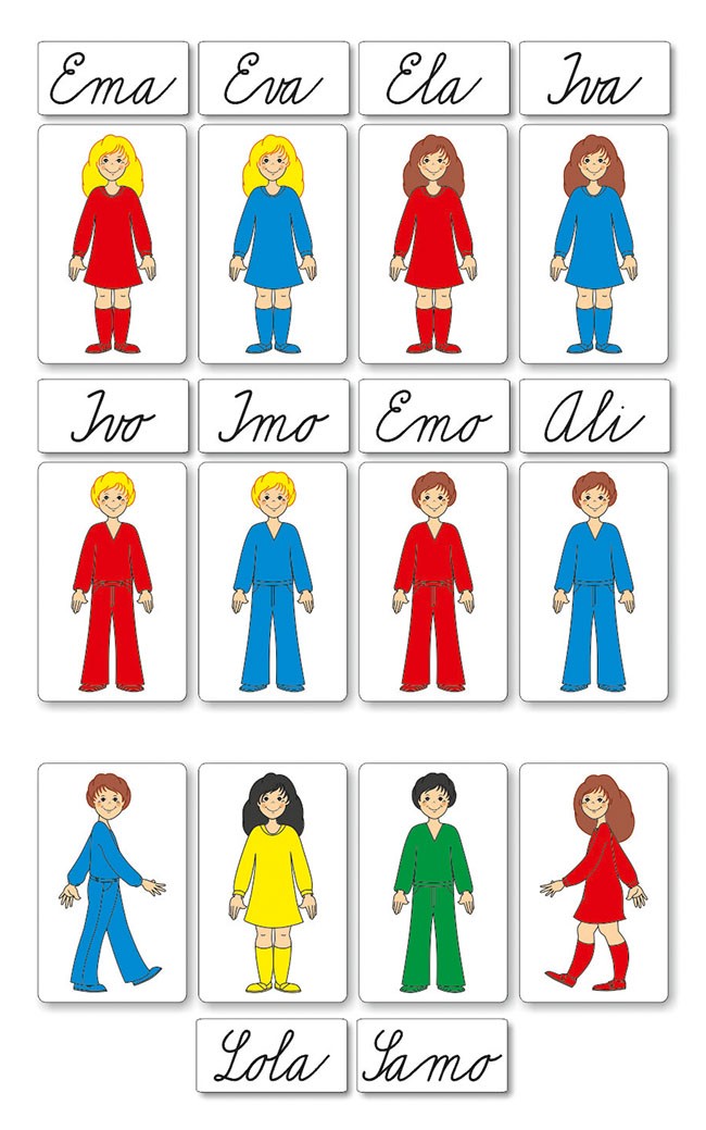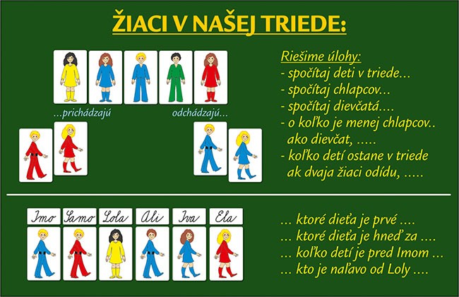 S touto pomôckou môžete zadať žiakom úlohy s rôznymi kritériami triedenia a riešiť nespočetné množstvo kombinácii na hodinách matematiky.Obrázky detí sú doplnené najčastejšie používanými menami zo šlabikára, čím sa výrazne umocňuje využitie pomôcky v medzipredmetových vzťahoch so Sj a s pomôckou Na nákupe aj s Prvoukou.