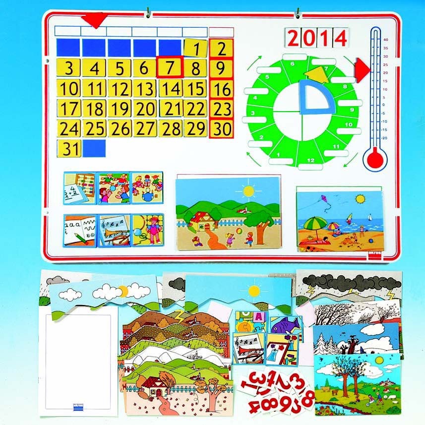 Pomôcka je kompletným nástrojom pre osvojenie si pojmov deň, týždeň, mesiac, rok, ročné obdobia, počasie. Umožňuje učiteľke ponúknuť deťom zaujímavé aktivity a vytvárať nové možnosti ako poznávať a chápať okolitý svet. Hra posiluje motiváciu spoznávať, utvárať slovno-logické myslenie, schopnosť riešiť problém, rozvíja prácu v kolektíve, manuálnu zručnosť detí. Tvorením rôzných jazykových hier deti spoznávajú a vnímajú: teplotu, počasie, priestorové pojmy a situácie, rytmus, pozorovanie prírody.Obsah dodávky:1 tabuľa - kovová, 70x50cm, farebne potlačená,4 ilustrácie - ročné obdobia,16 ilustrácií - kombinovateľné puzzle, vyjadrujúce počasie,10 ilustrácií - aktivity v škole alebo v škôlke,6 označovacích šípok,31 kartičiek - čísla od 1 do 31,22 kartičiek - čísla (roky),1 vrecko - samolepiace magnety biela magnetická fólia s lokalizovaným popisom,didaktická príručka.Odporúča sa pri učení druhého jazyka.