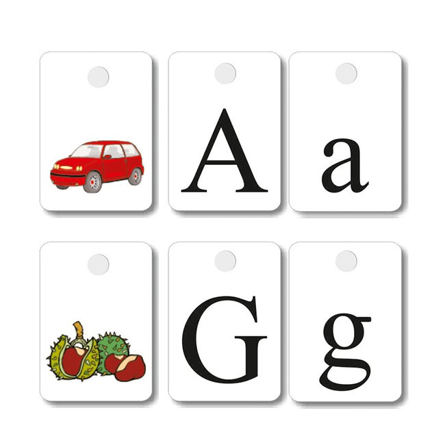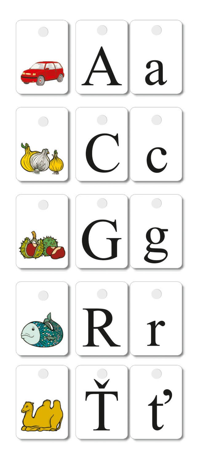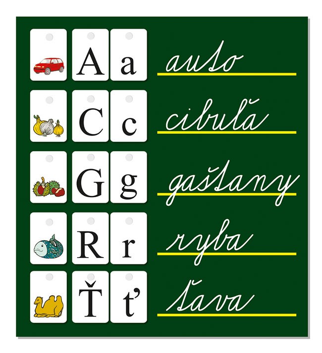 Praktická učebná pomôcka pri nácviku čítania a písania jednotlivých písmen abecedy. Veľké a malé tlačené písmená + nápovedné obrázky, obojstranne, farebne tlačené. Využitie na magnetickej tabuli, na lavici pri práci žiakov.