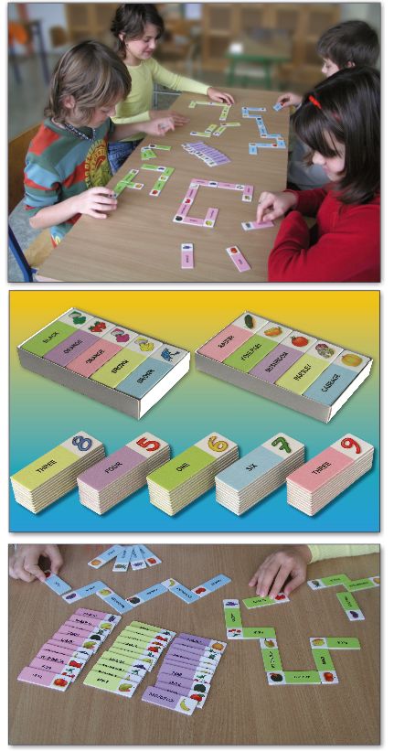 Ďalší variant klasickej pomôcky v novom atraktívnom šate. Potrebujete zamestnať neposedných žiakov, hravou formou utvrdiť alebo rýchlo preskúšať znalosti učiva? Dominový rýchlotest obsahuje v jednom balení 5 samostatných sád tak, aby mohli pracovať súčasne piati žiaci alebo päť skupiniek. Každá sada obsahuje 10 kartičiek so slovnou zásobou z daného okruhu. Žiak začne položením prvej kartičky. K obrázku, ktorý je na nej uvedený, vyhľadá slovíčko na niektorej z ostatných kartičiek. Takto pokračuje až kým neusporiada všetky kartičky svojej farebnej skupiny. Pri správnom zložení všetkych kartičiek musí obrázok na poslednej nadväzovať na slovíčko prvej.Materiál :pevný kartón, hr. 2mm.Obsah:50 laminovaných kartičiek z 2mm kartónu (5 x 10 príkladov - 7,5x2,5cm/1kartička).