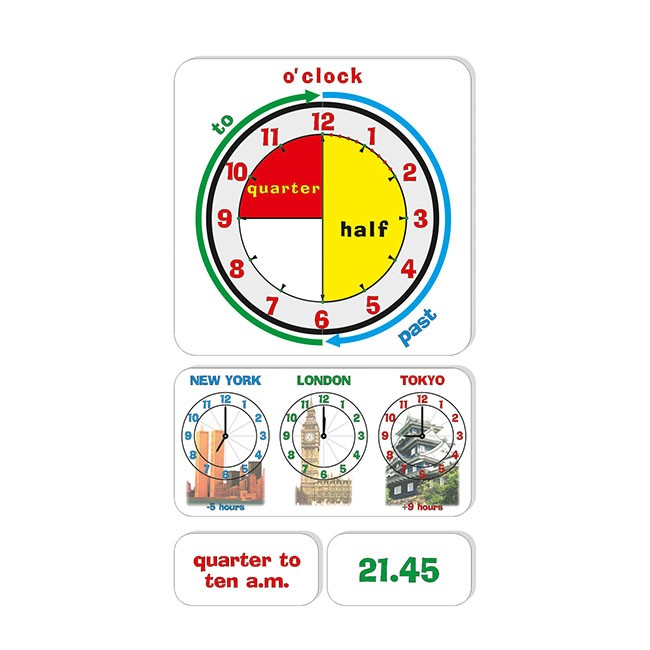 Súbor obrázkov a textových kartičiek umožňuje nácvik, precvičovanie a upevňovanie slovnej zásoby, tvorenie viet a dialógov k téme Čas I - AJ.