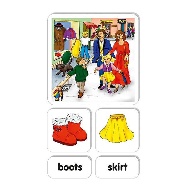 Súbor obrázkov a textových kartičiek umožňuje nácvik, precvičovanie a upevňovanie slovnej zásoby, tvorenie viet a dialógov k téme Oblečenie - AJ.