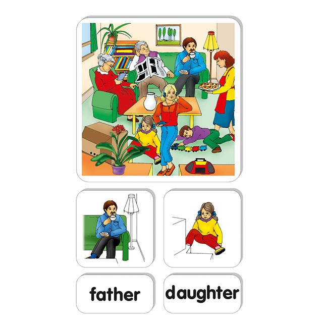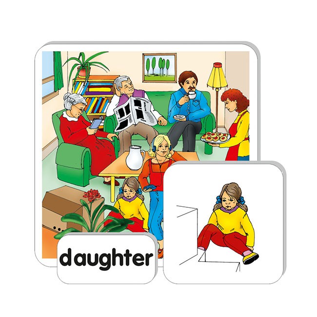 Súbor obrázkov a textových kartičiek umožňuje nácvik, precvičovanie a upevňovanie slovnej zásoby, tvorenie viet a dialógov k téme Rodina - AJ.