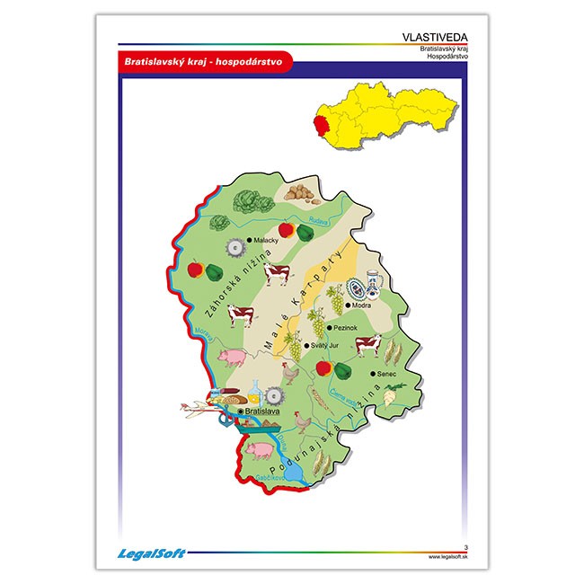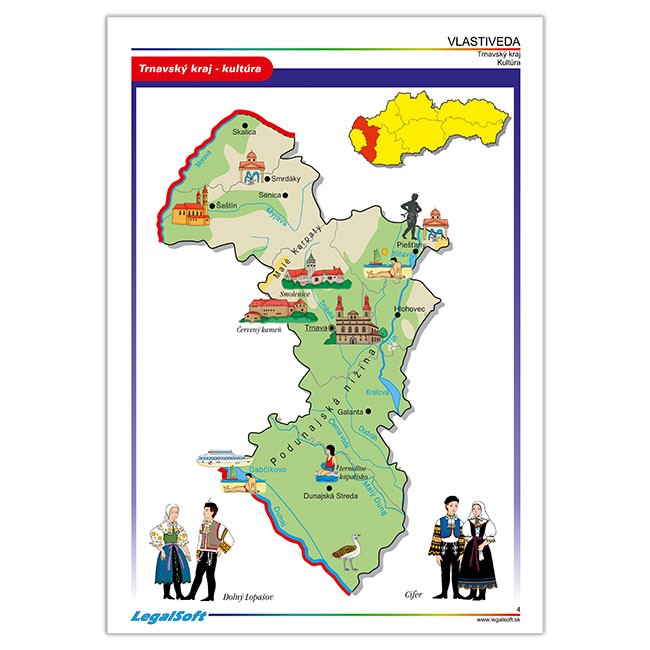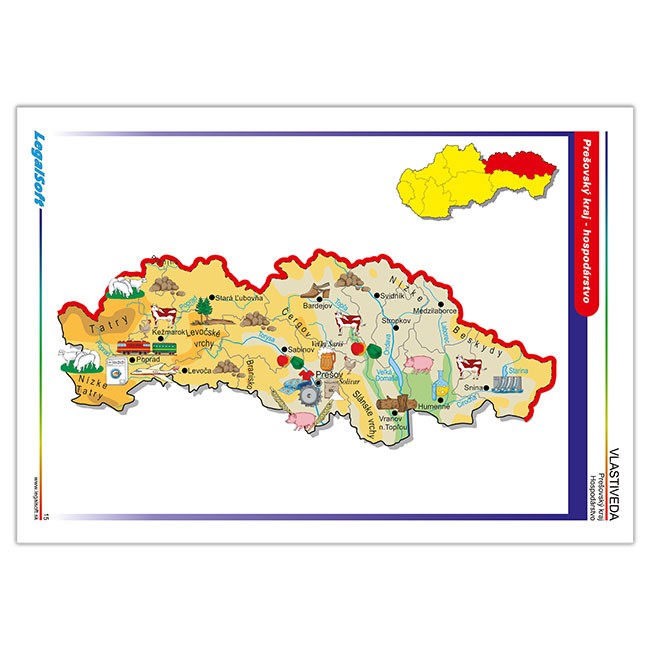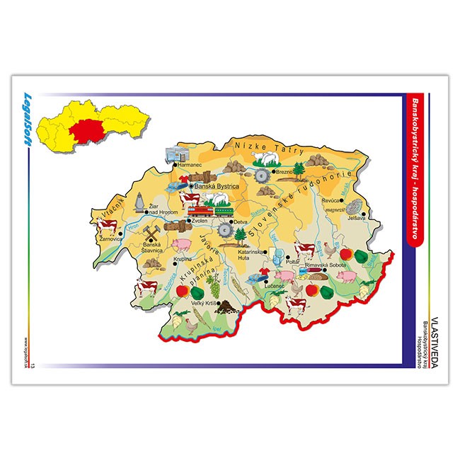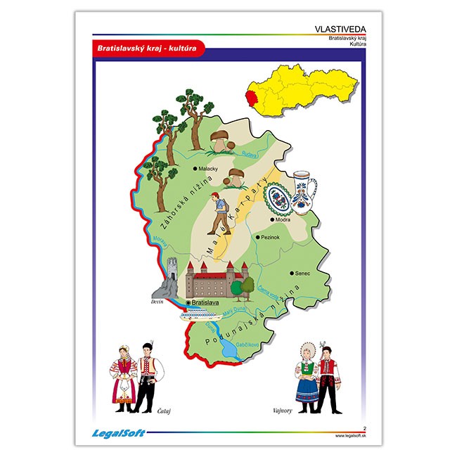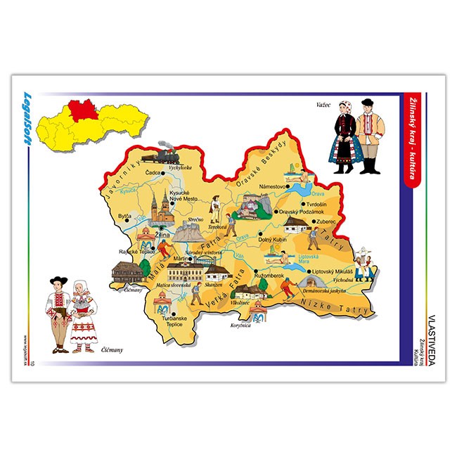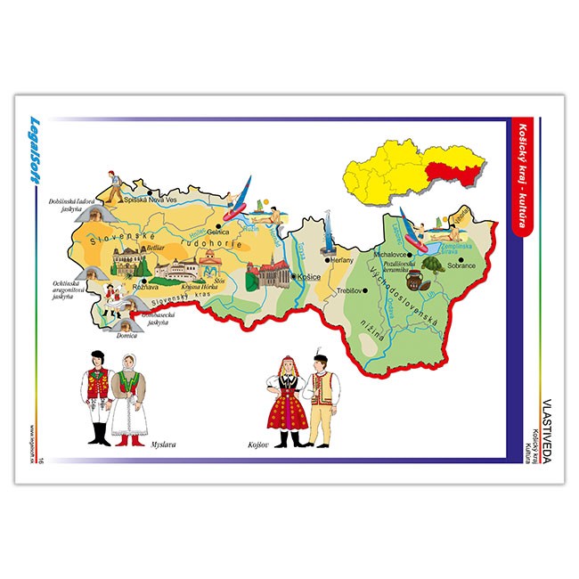Žiaci vo Vlastivede cestujú po celom Slovensku a zapamätať si rieky,nížiny,pohoria,čo sa kde pestuje a vyrába,kde sú známe kultúrne pamiatky,či kam ísť za turistikou,to nie je také jednoduché.Spoznávať Slovensko Vám pomôžu aj tieto originálne spracované mapy,ktoré postupne predstavujú:Bratislavský,Trnavský, Nitriansky,Trenčiansky,Žilinský,Banskobystrický,Prešovský a Košický kraj.Každá mapa približuje základné hospodárske a kultúrne hodnoty kraja,známe turistické miesta a ukážky niektorých krojov.