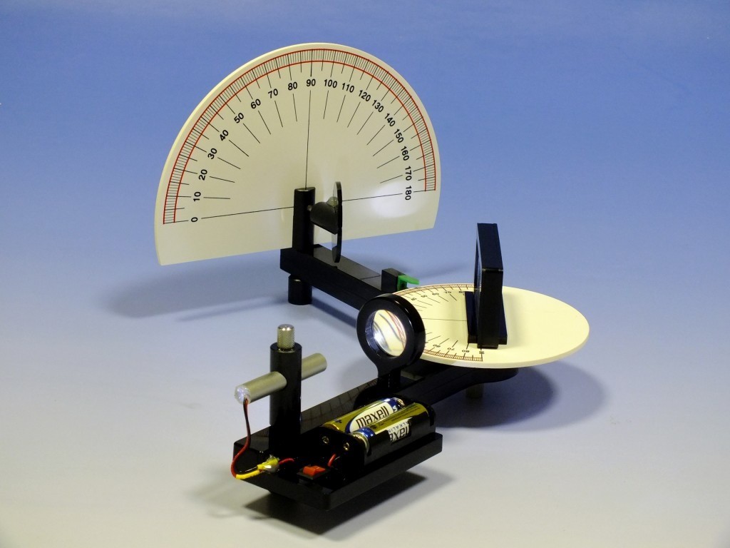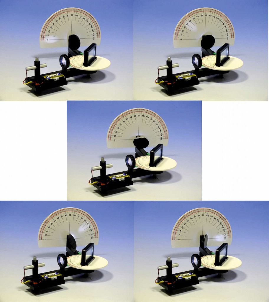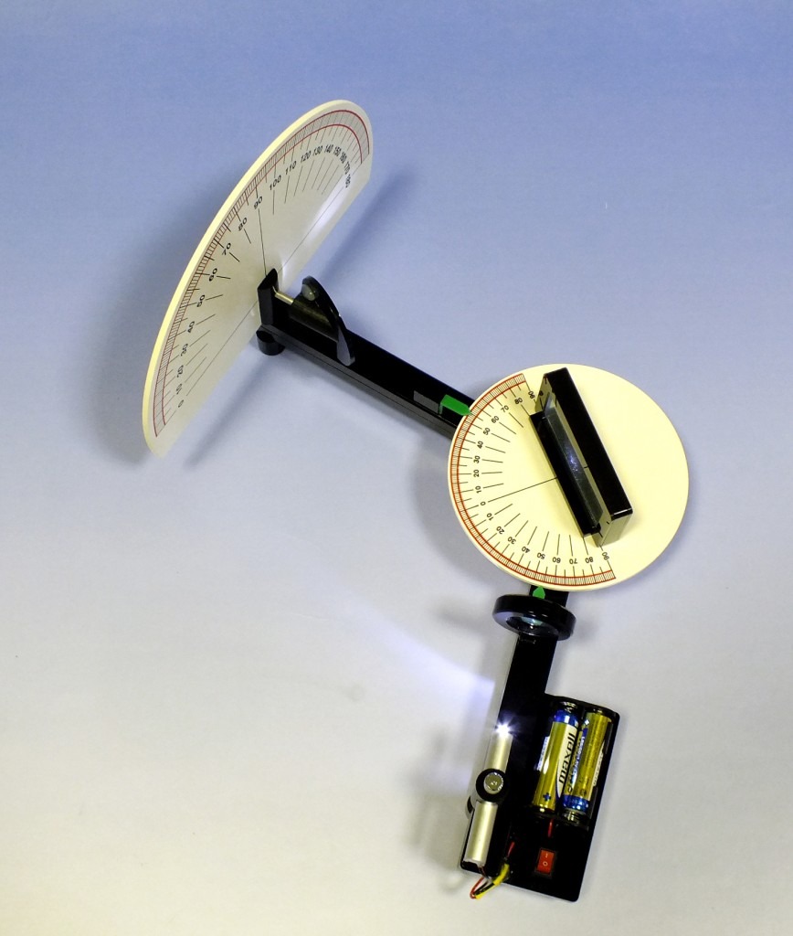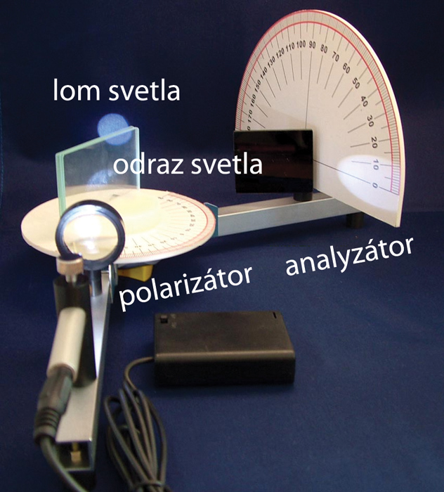 Čo môžete naučiť týmto prístrojom: Polarizácia svetla, Brewster - polarizácia, polárne otáčanie materiálov. Dokázateľné pokusy: - Dve stojacie zrkadlá v Brewster - ovom uhle, z ktorých jedno je otočné, pomocou ktorých môžeme dokázať polarizáciu svetla, - Uholná závislosť stupňa polarizácie. Pokusné zostrojenie: Roztvorme dve krídla prístroja na 2x56°. K nastaveniu použíme stolík s uhlomerom. Odčítavanie stupňov vykonajme pri vnútorných hranach rúčky. Smer 0° (kolmica dopadu) stále sa musí zhodovať so smerom pomyselnej osi uhla! Zostrojenie má byť na základe obrázkov. Pripojme zdroj svetla k nosníku batérie, pričom planina tienidla analyzátora musí byť kolmá na optickú os (na rúčku prístroja). Pozíciu jednotlivých komponentov môžeme zafixovať skrútkami, ktoré sa nachádzajú na spodku prístroja. Pri zostrojení podľa obrázku, zdroj svetla upevníme takej polohe, kde je najostrejšia sveteľná tieň na tienidle analyzátora. Otáčajme zrkadlo analyzátora: intenzita odrážaného svetla sa priebežne mení, pri kolmej polohe zrkadla úplne zmizne. Účinnosť polarizátora sa dá stupňovať, ak používame viazanicu z viacerých sklených platní. Ako polarizátor sa dá používať aj čierne zrkadlo nachadzajúce sa v súprave, keď chceme analyzovať iba svetelnú lúč. Tento jav sa dá vysvetliť tým, že na analyzátor už pripadá polarizované svetlo, a to celkovo uhasne svetlo, ak je kolmé na jeho polarizovanú planinu. Dobré nastavenie sa dá pevne určiť skrútkami a fixačnými kliešťami, ktoré sa nachádzajú pod stolíkom, takýmto spôsobom môžeme bezpečne dať kolovať a prezentovať jav v ľubovoľnej polohe.