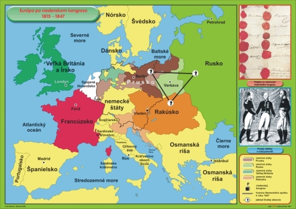 Významné štáty a centrá, územné zmeny a zisky po Napoleonovej porážke, viedeňský kongres, nemecký spolok.Nástenná mapa 120 x 90 cm, biele lišty. Materiál: silná biela fólia vnútri vystužená tkaninou. Prílohou pomôcky je CD, ktoré obsahuje danú mapu s legendou a pracovný list (čiernobielu kópiu). Ten je možné podľa potreby vytlačiť a využit ako námet k opakovaniu alebo doplneniu poznámok žiakov a študentov.Štandardne dodávané s zaklapavajúcimi lištami.