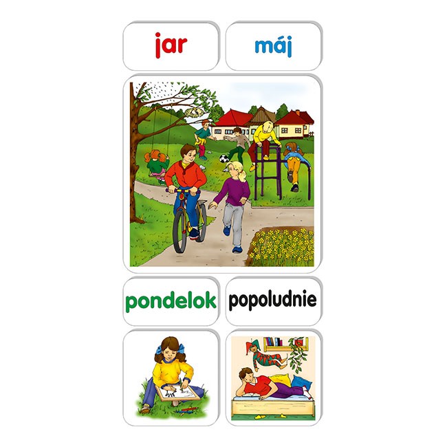 Pestrý súbor magnetických obrázkov na precvičovanie a upevňovanie slovnej zásoby k téme dni v týždni a ročné obdobia. Doplnená textovými kartičkami na osvojenie názvov mesiacov, ročných období, dní, častí dňa a prísloviek času. Pomôcka je určená na slovenský jazyk , umožňuje nácvik a tvorenie viet a dialógov v skupinách alebo pri samostatnej práci žiakov.