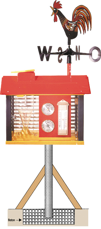 barometer, hydrometer, min. - max. teplomer, zrážkomer, veterný kohút (na označenie smeru vetra so svetovými stranami).Rozmer:60x40x60cm.