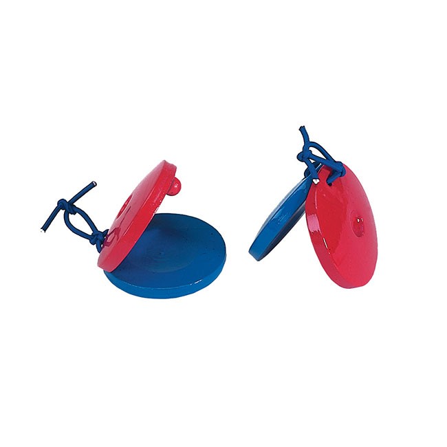 Malé drevené kastanetky z modrého a červeného lakovaného dreva.