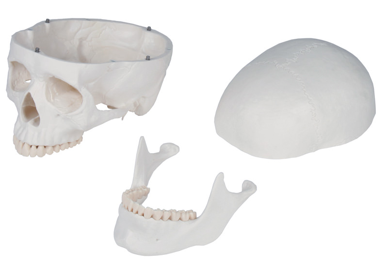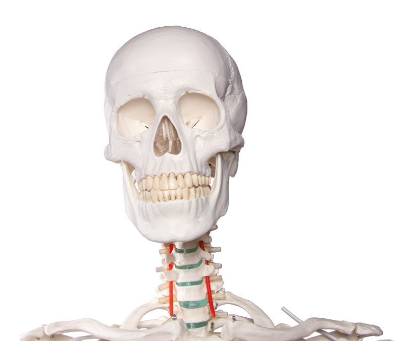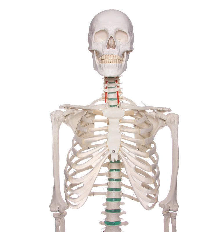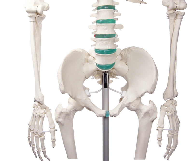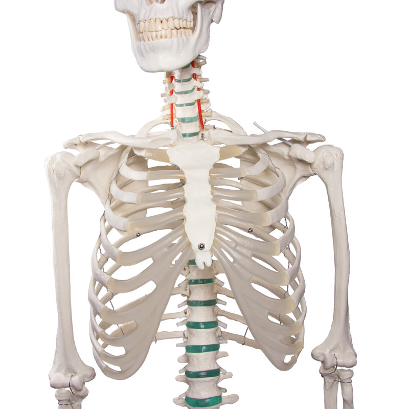 Tento vysoko kvalitný anatomický model ľudskej kostry predstavuje kostru muža dospelého veku.Ponúka nám štúdium všetkých približne 206 kostí ľudského tela.Štruktúry vyobrazené na modeli sa svojou kvalitou takmer nelíšia od skutočných kostí.Z modelu je možné veľmi ľahko odňať horné aj dolné končatiny a lebku,ktorú môže rozložiť na spodinu lebečnú a dolná čeľusť.Táto trojdielna lebka zodpovedá skutočnosti a obsahuje všetky štruktúry ako lebka reálna.Je teda veľmi vhodná pre štúdium anatómie.Veľkým benefitom je aj pohyblivosť ramenného,bedrového a kolenného kĺbu, čo nám umožňuje pochopiť pohyb,ktorý tieto kĺby zaisťujú. Anatomickú dokonalosť modelu dokazuje aj vyobrazenie chrbtice a miechy,spolu s miechovými nervami a vertebrálnymi tepnami. Na modeli nájdeme tiež ukážku herniácie disku,tj. Hernie platničky.