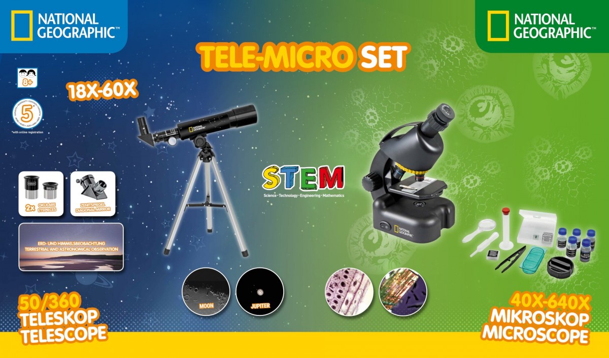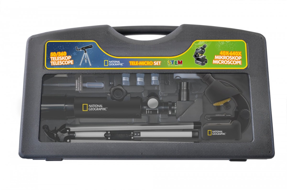 Detský astro teleskop a mikroskop National Geographic je súprava pozostávajúca z veľmi jednoduchého hvezdárskeho ďalekohľadu a biologického mikroskopu pre mladšie deti (6-8r.), nie je vhodný pre staršie deti (napr. na 2. stupni základnej školy). Astro teleskop NGC 50/360 AZ s malým stolovým statívom s 50mm achromatickým objektívom a 360mm ohniskom dosiahne zväčšenie 18x a 60x, dostatočné pre pozorovanie Mesiaca a niektorých ďalších jasnejších vesmírnych útvarov. Biologický mikroskop s niekoľkými pevnými zväčšeniami v rozsahu 40x-640x a potrebným príslušenstvom (pipeta, liahne, hotové preparáty, nôž, pinzeta) nájde využitie pri pozorovaní tenkých biologických preparátov (nedajú sa s ním pozorovať povrchy nepriehľadných vzoriek). Tento detský drobnohľad je vybavený elektrickým osvetlením napájaným 2 batériami typu AA. Súprava je určená pre detských začiatočníkov a uvedie deti do sveta astronómie a mikroorganizmov, všetko v pútavom balení a plastovom kufríku na pohodlnú prepravu a skladovanie.