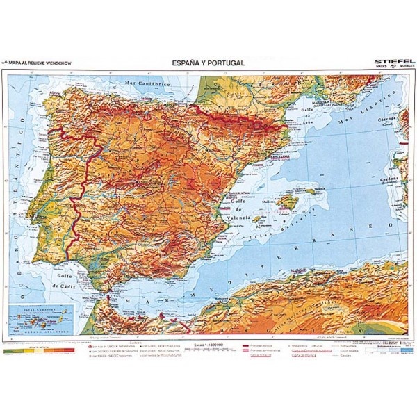 Všeobecnogeografická mapa Španielska a Portugalska v španielčine je vhodná na výučbu španielskeho jazyka a geografie.