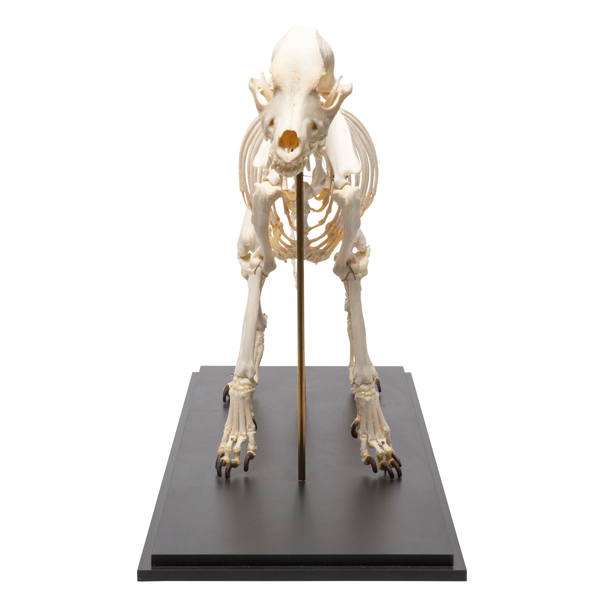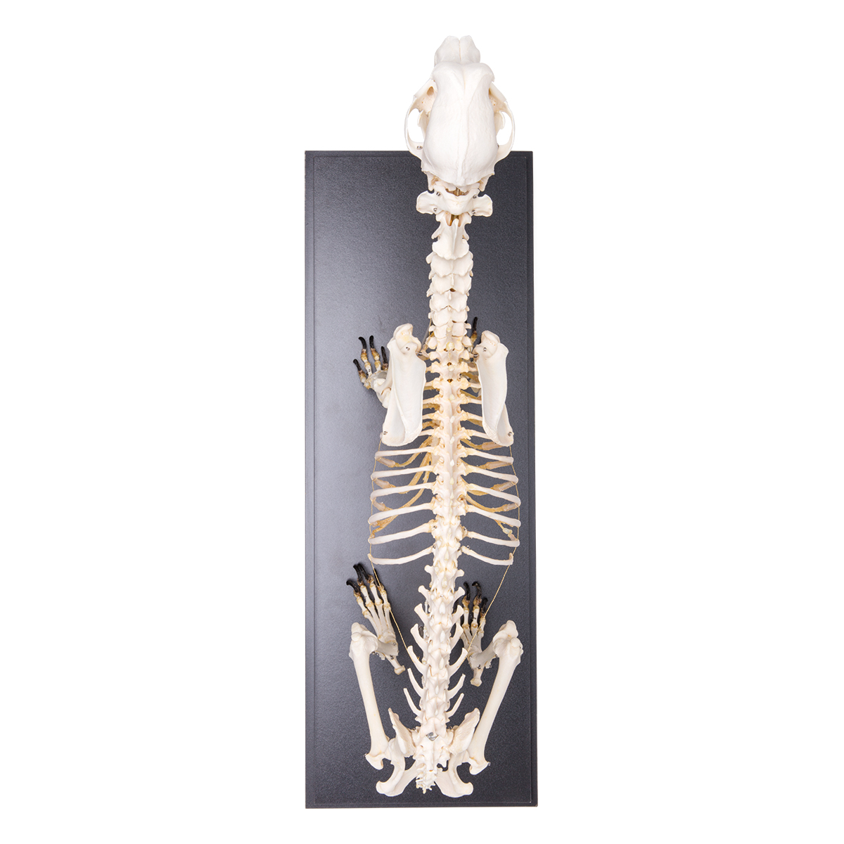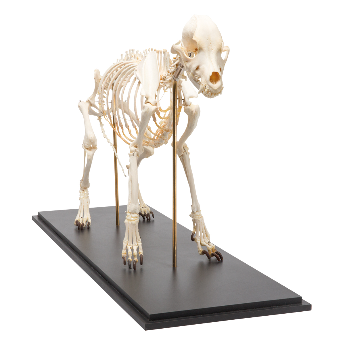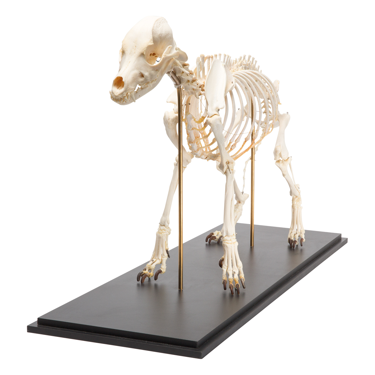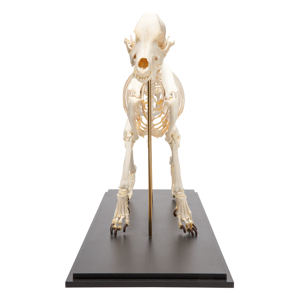 Preparovaná kostra skutočného psa domáceho pozostávajúca z viac ako 280 kostí (v závislosti od dĺžky chvosta) namontovaná na drevenom podstavci.Dĺžka:55 až 75cm.Hmotnosť:4,5 - 5,5 kg.