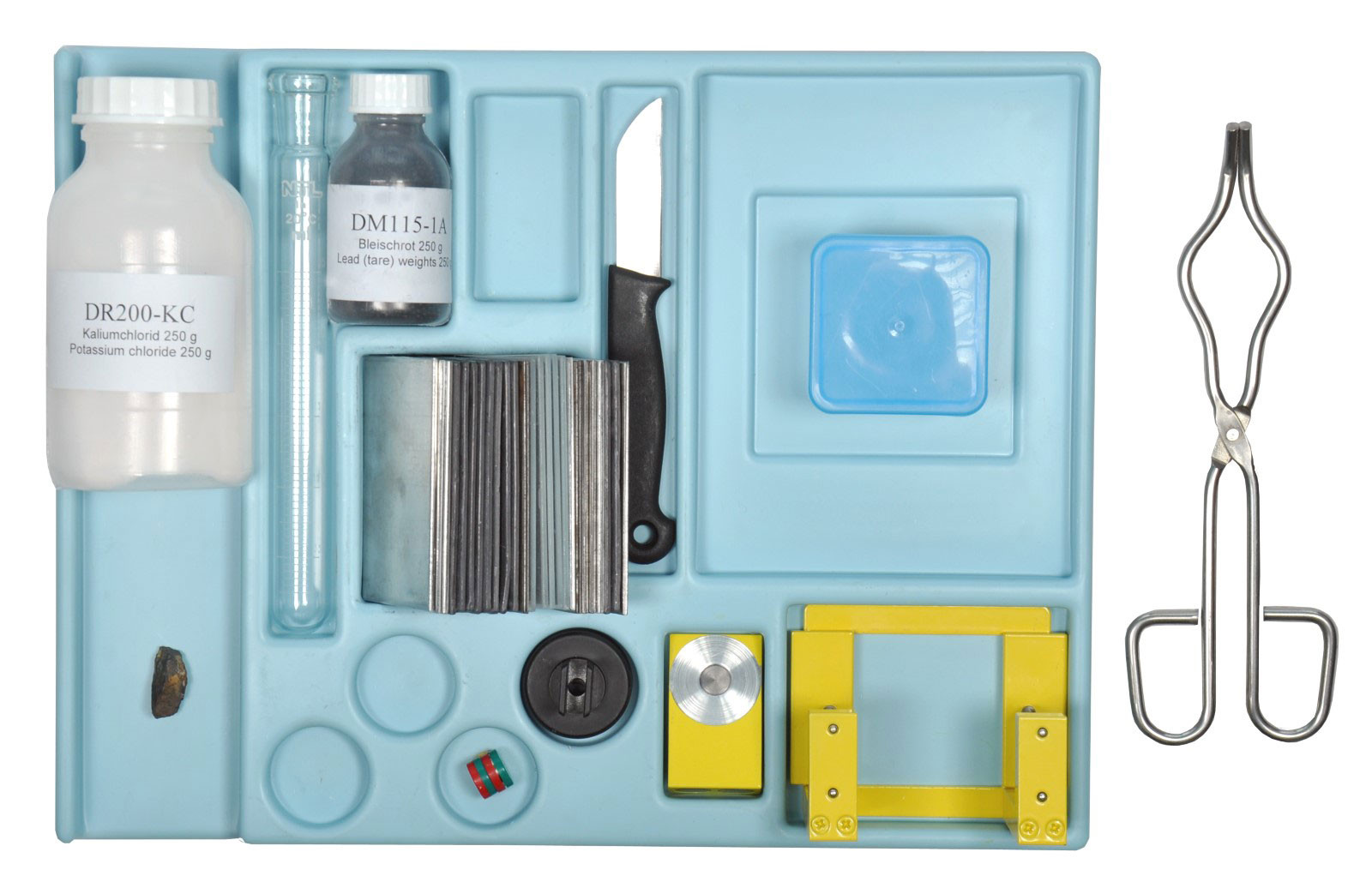 Obsah:DR200-KC Chlorid draselný, 250 g; DR201-1C Kolumbit; DR250-1A Absorpčné platne, sada; DR212-1H Upínač absorpčných platní; DR201-1R L držiak pre preparáty, magnetický; C3551-2T Skúmavka s delením; DM115-1A Kalibrovacie závažie, sypké 250 g; DR213-1A Odchyľujúci nadstavec pre preparáty; DE407-1A Malé kruhové magnety, pár; C6008-1B Dóza s nasadzovacím vekom, 80 ml, PP, 50 x 50 x 40 mm ; C7418-2A Laboratórny nôž; C7415-2Z Dvojité kliešte; P7906-1R Plastová vložka Jadrová fyzika; P7806-1K Úložný box II malý, s krytom.