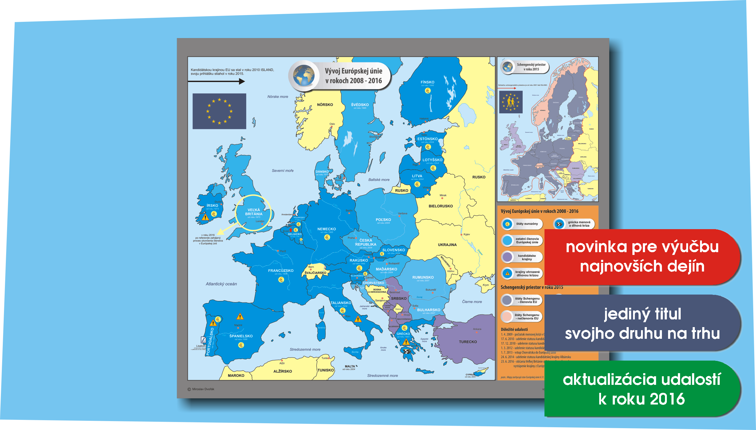 Nástenná mapa zachytáva najdôležitejšie súčasné problémy a udalosti, týkajúce sa vývoja Európskej únie. Obsah pomôcky je aktualizovaný k 31. 8. 2016. V cene sú umelohmotné zaklapávacie lišty s úchytom. Materiál: silná biela fólia vnútri vystužená tkaninou. Súčasťou pomôcky nie je CD. Obsah: štáty Európskej únie, členovia eurozóny, kandidátske krajiny, sídlo európskych inštitúcií, Lisabonská zmluva, dluhová a menová kríza, problematika Grécka, schengenský priestor, odchod Veľkej Británie z Európskej únie, dôležité udalosti rokov 2008 - 2016.Nástenná mapa 120 x 90 cm.Štandardne dodávané s zaklapavajúcimi lištami.