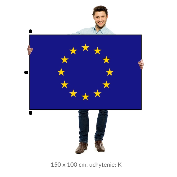 Vlajka Európskej únie v štandardnom pomere 3:2 rozmeru 150cm (šírka) x 100cm (výška) vyrobená z nepáravého úpletu gramáže 115 gr./m2 potlačeného disperynou technológiou s následným parným fixovaním a praním. Po obvode je zaobšitá dvojitým stehom pre dlhšiu životnosť. Vlajka je vhodná pre vonkajšie použitie.