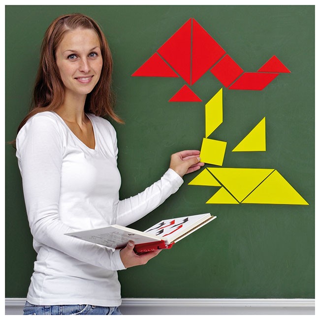 Výborná demonštračná pomôcka na magnetickú tabuľu pre učiteľa, zatiaľ čo deti pracujú v lavici. Zábava pre celú triedu. Veľký magnetický tangram je vyrobený z hrubého a pevného plastu v 3 farbách / žltá, červená, modrá. 1 tangram tvorí 7 dielov.7 základných geometrických tvarov na tvorenie najrôznejších obrazcov od jednoduchých po najzložitejšie.