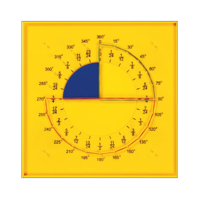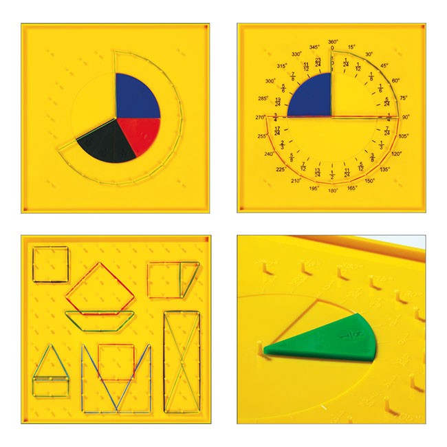 Vďaka tejto sade na zlomky a geometriu je možné pre žiakov vytvárať rôzne cvičenia a možnosti. Pomôcku tvorí základná doska, ktorá má z jednej strany kruh (priemer 10cm) na vloženie plastových zlomkov a kolíky na uchytenie gumičiek na rôzne geometrické obrazy. Je potlačená číslami a stupňami. Na druhej strane dosky je 121 / 11x11 kolíkov pre tvorenie tvarov.
